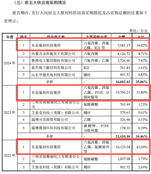招股书显示,东岳氟硅科技集团常年位列公司第一大供应商及前五大客户名单。这种紧密的捆绑关系虽在业务协同上具有一定合理性,但其交易的公允性、必要性及透明度却遭受严峻考验。如何证明采购与销售定价完全遵循独立第三方原则?如何避免成为控股股东进行利益输送的隐蔽通道?这不仅是交易所多轮问询函反复追问的核心,亦是投资者判断公司独立经营能力的试金石。