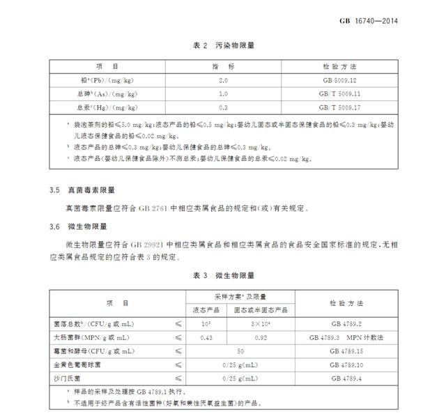 另外,该检测报告显示,其检测方法系依据GB 23200.121-2021与GB 23200.113-2018两项国家标准。但实际上,此两项国家标准适用于植物源性食品,包括蔬菜、水果、食用菌、谷物、油料、坚果、茶叶、植物油等,而非保健食品。适用于保健食品的GB 16740-2014《食品安全国家标准保健食品》则对重金属污染物、真菌毒素、微生物、食品添加剂等限量作出了更明确的规定。