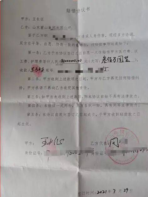 最终,王长征同意了与重山集团调解。2021年7月29日,王长征与重山集团签订的《赔偿协议》显示,山东重山集团员工陈某给王长征造成人身伤害,经多方协调,山东重山集团于协议签订之日,自愿一次性赔偿王长征医疗费、误工费、护理费等计人民币300万元。王长征收到上述款项起,双方再无任何赔偿纠纷,王长征不再向山东重山集团追究其他责任。