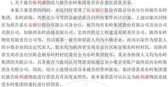 判决书显示:上述案件立案受理的同时,法院同时受理了长安银行各分行诉被告东岭集团等的金融借款合同纠纷案件共计35案。