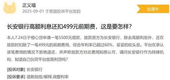 9月1日,有消费者反映称,“本人7.24日于橙心贷申请一笔5500元借款,放款资方为长安银行,除去高额利息外,还在放款时扣除了一笔499元的前期费用,综合年利率已超过60%,妥妥的砍头息。平台在承认该笔费用的情况下拒绝退还,并声称放款方对此费用知悉认可,请问长安银行作为持牌机构,知道自己伙同平台放高利贷吗?”