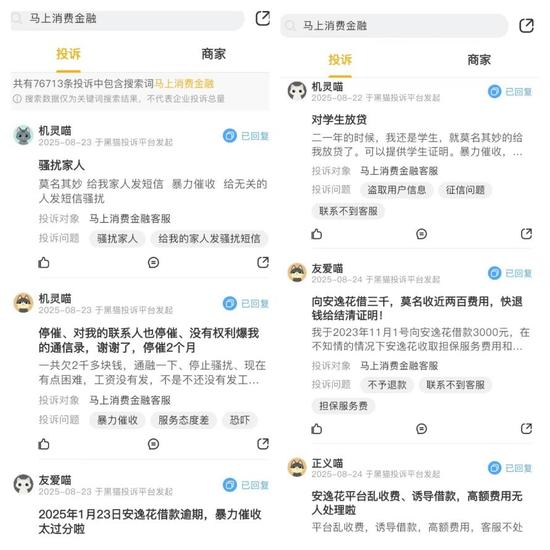 这些问题,如今依然存在。笔者通过黑猫投诉平台检索“马上消费金融”发现,相关投诉量超过7万,其中针对“暴力催收”的不在少数。有用户称,“马上消费金融盗取私人信息,暴力催收,太过分啦!”,还有用户表示“安逸花暴力催收他们催收说他们的合同大于法律”。
