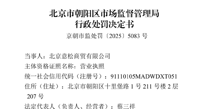京朝市监处罚〔2025〕5083 号行政处罚决定书显示,2025年1月9日,接到关于北京意松商贸有限公司的案源,市民举报当事人销售的“不老奇迹活性免疫球蛋白配方驼乳粉”涉嫌违法,提供了举报证据文件。