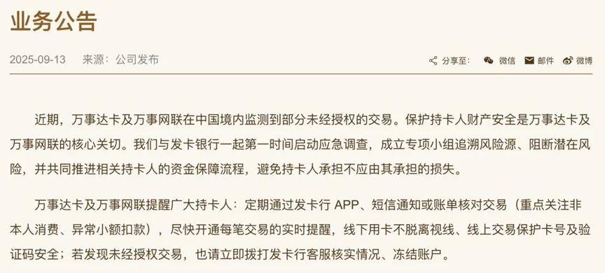 在浦发银行发布情况说明后,万事网联亦发布业务公告称,“万事达卡及万事网联在中国境内监测到部分未经授权的交易。保护持卡人财产安全是万事达卡及万事网联的核心关切。我们与发卡银行一起第一时间启动应急调查,成立专项小组追溯风险源、阻断潜在风险,并共同推进相关持卡人的资金保障流程,避免持卡人承担不应由其承担的损失。”