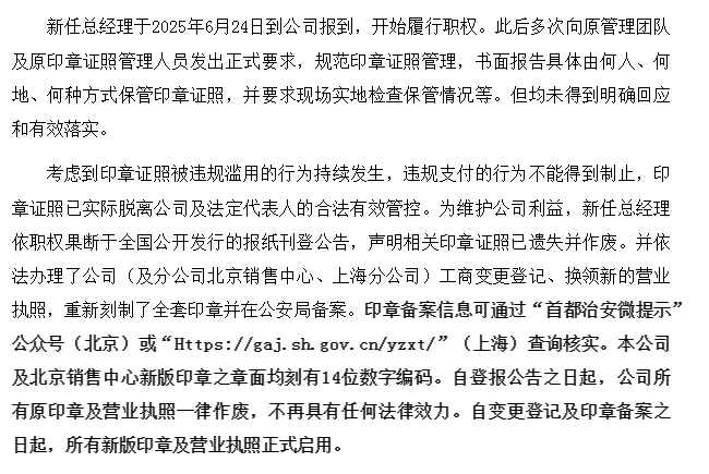公开信称:“自登报公告之日起,公司所有原印章及营业执照一律作废,不再具有任何法律效力。自变更登记及印章备案之日起,所有新版印章及营业执照正式启用。”