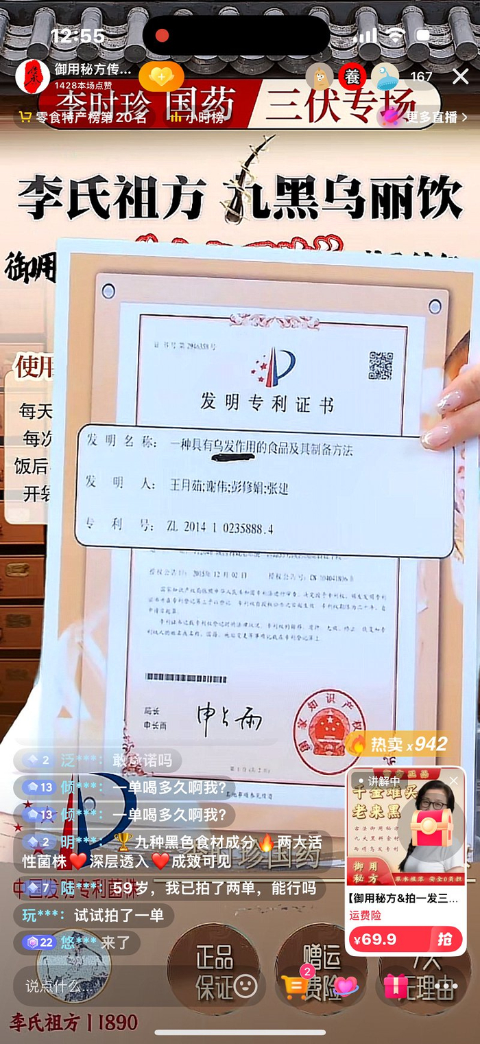 在“御用秘方传承—第五代”直播间里,主播宣称九黑桑葚乌丽饮添加了两项国家专利菌株。为增强可信度,主播表示虚假宣传“须承担法律责任”,甚至称“无中生有会面临十年以上牢狱之灾”。随后主播展示发明专利证书,声称:“你们可以不相信我,但一定要相信我们家的发明专利菌株,证书上有专利号和红章,是受法律保护的,假一倒贴1万元。”
