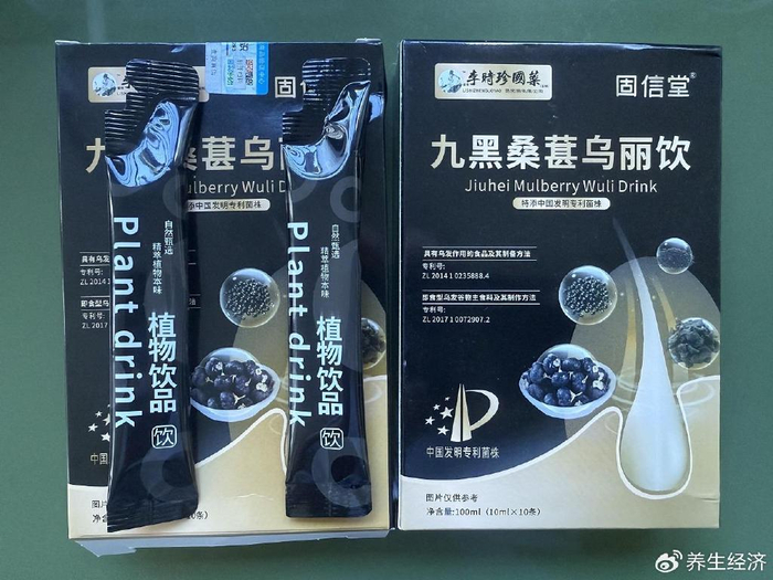固信堂九黑桑葚乌丽饮外包装标注“中国发明专利菌株”。张文章/摄