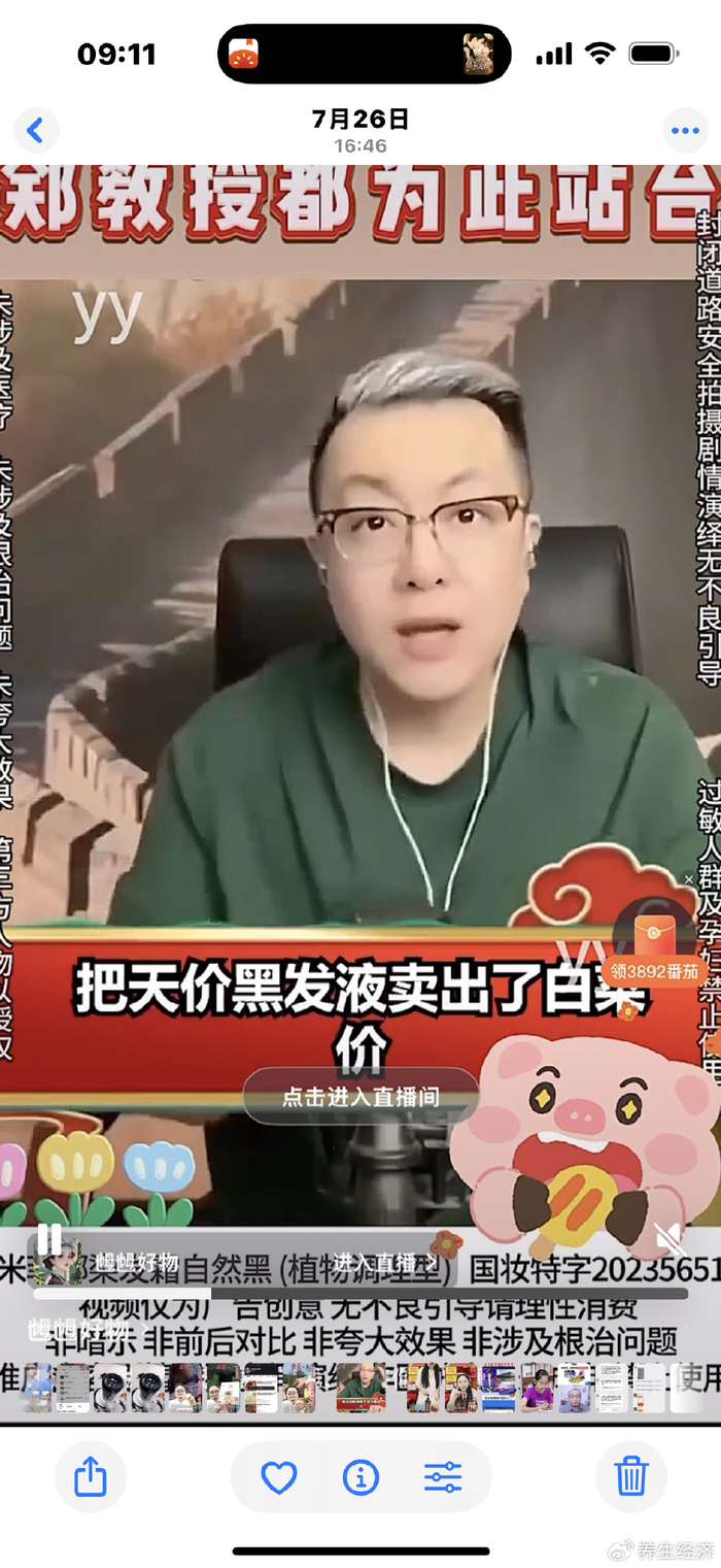 9月10日,账号“弘硕嬿嬿”发布的视频中,主播称现在有免费试用的机会。随后一名有明显修图痕迹,但貌似知名教授郑某的人在台上进行推广:“一个拥有先进技术的国家难道去不掉你的满头白发?今年,我国研究所专为老百姓研发出了一款能攻克白发难题的优质国货。我之前从来不为任何产品做推荐,但这次我要为它破一次例。现在有一个办法能帮你把白发养回来,花费还不到一百元。”