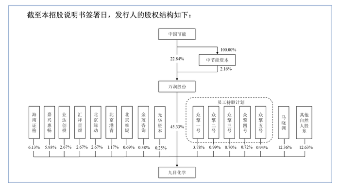 招股书显示,万润股份直接持有九目化学45.33%的股份,为九目化学控股股东;中国节能及其全资子公司中节能资本合计持有万润股份约25%的股份,为九目化学的实际控制人。