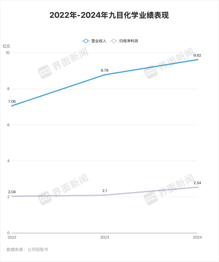 九目化学在2022-2024年间一直保持稳健增长,营业收入从7.06亿元攀升至9.62亿元,归母净利润也从2.04亿元增长至2.54亿元。
