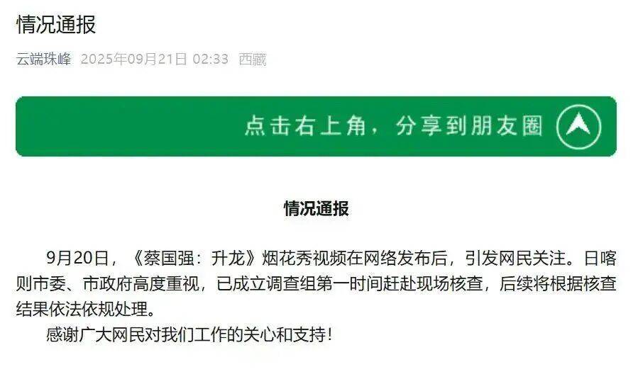 但随着舆情发酵,当地政府于9月21日凌晨在西藏“云端珠峰”公众号发布情况通报:9月20日,《蔡国强:升龙》烟花秀视频在网络发布后,引发网民关注。日喀则市委、市政府高度重视,已成立调查组第一时间赶赴现场核查,后续将根据核查结果依法依规处理。