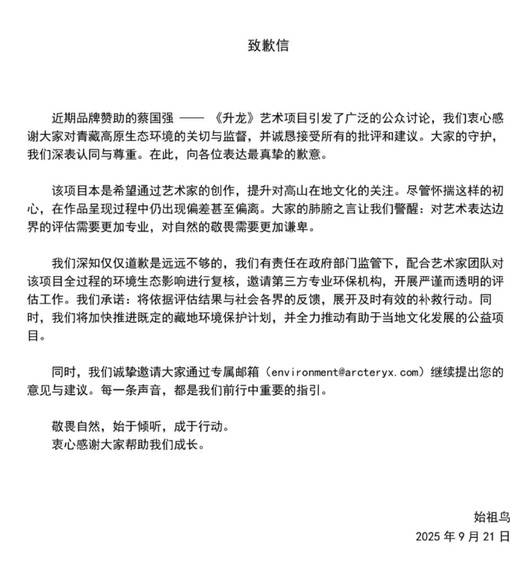9月21日,蔡国强工作室与始祖鸟先后发布致歉声明,就双方合作在西藏喜马拉雅山脉举办的《升龙》烟花艺术项目引发的生态争议作出回应。