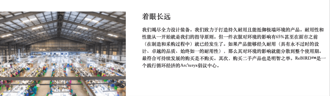 秉承与自然和谐共生的可持续理念,在很多服装品牌以及网络平台探索的减碳方案是旧衣回收时,始祖鸟将目光投向循环模式,于2021年推出了ReBIRD™可持续计划。该计划通过升级改造、回收利用和维修养护等方式,优化传统生产工艺流程,试图打破“原料-制造-使用-废弃”线性模式,转向一个无限循环的新模式。这一创新性可持续计划不仅为始祖鸟赢得了多个奖项,也获得了消费者的认可与好评。