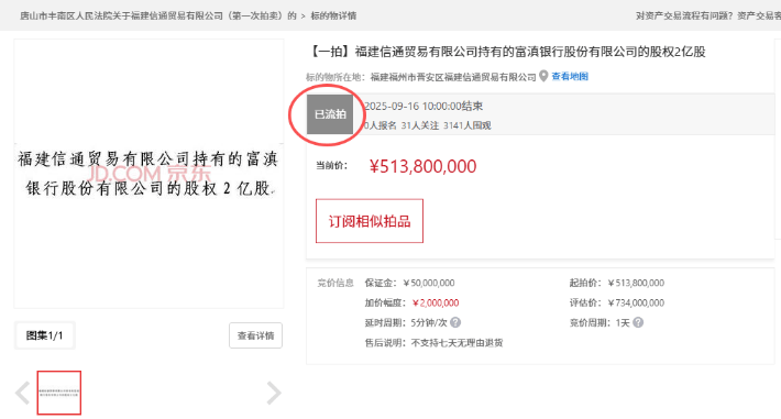 公开资料显示,作为富滇银行第五大股东的福建信通贸易有限公司因深陷债务危机,其持有的2亿股富滇银行股权于2025年9月15日公开拍卖,起拍价较评估价(7.34亿元)折价约30%,但截至拍卖当天结束,市场观望情绪浓厚,累计有31人关注,数千人围观,但因始终无人报名,最终流拍。