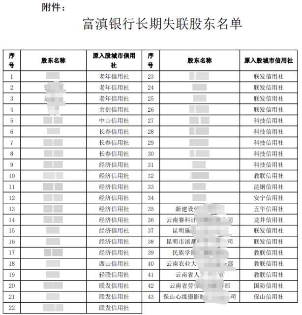 更值得关注的是,富滇银行于2025年6月20日曾发布《关于寻找长期失联股东的公告》,附件列出的“长期失联股东名单”涉及43名自然人及企业股东,这些股东均是原城市信用社的入股方,因历史原因与银行失去联系。从名单可见,失联股东涉及老年信用社、岔街信用社、中山信用社等多家原城市信用社,股东身份包括自然人(如董某、张某等)和企业(如云南赛科计算机服务公司、昆明施登达实业公司等)。