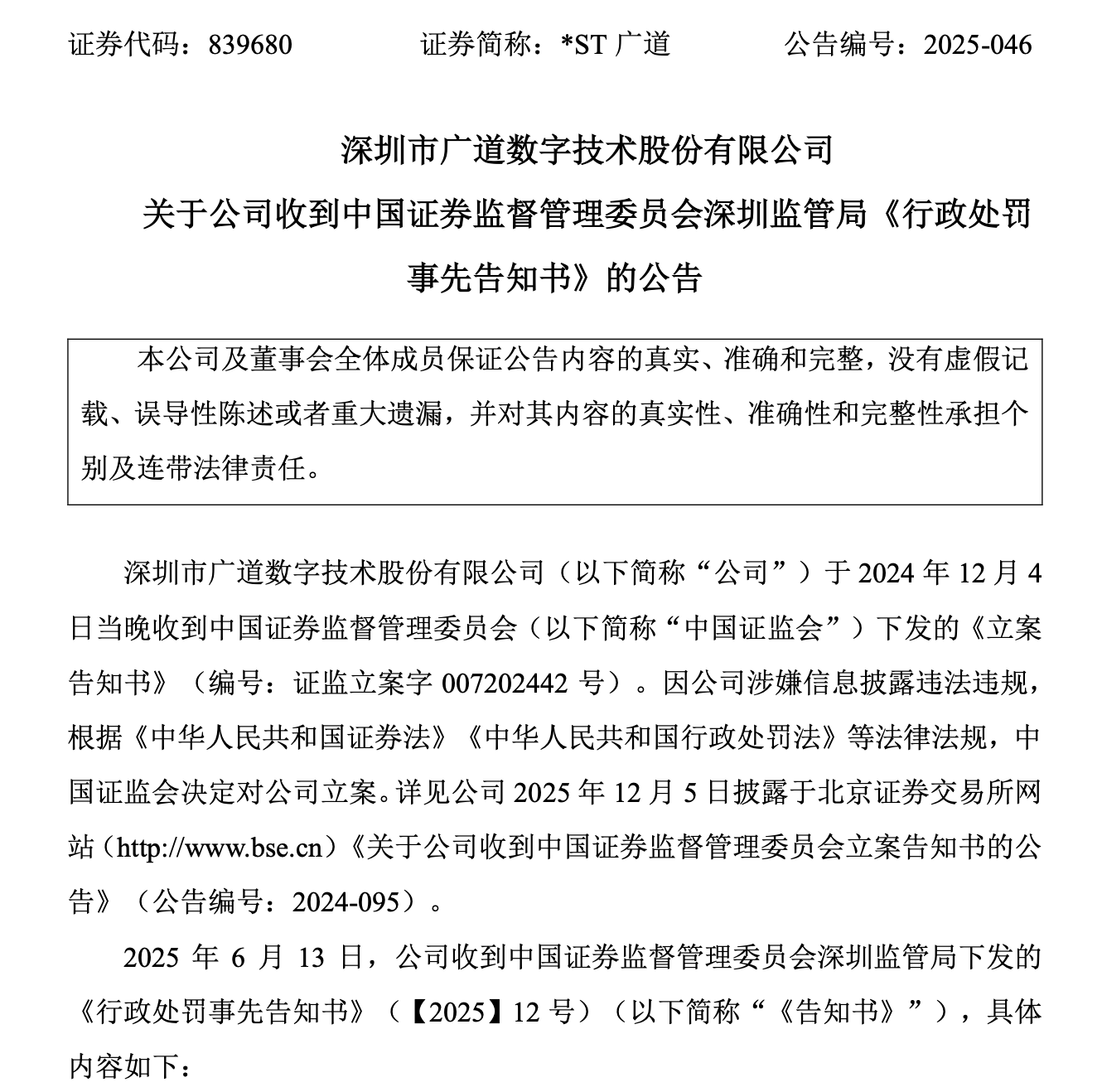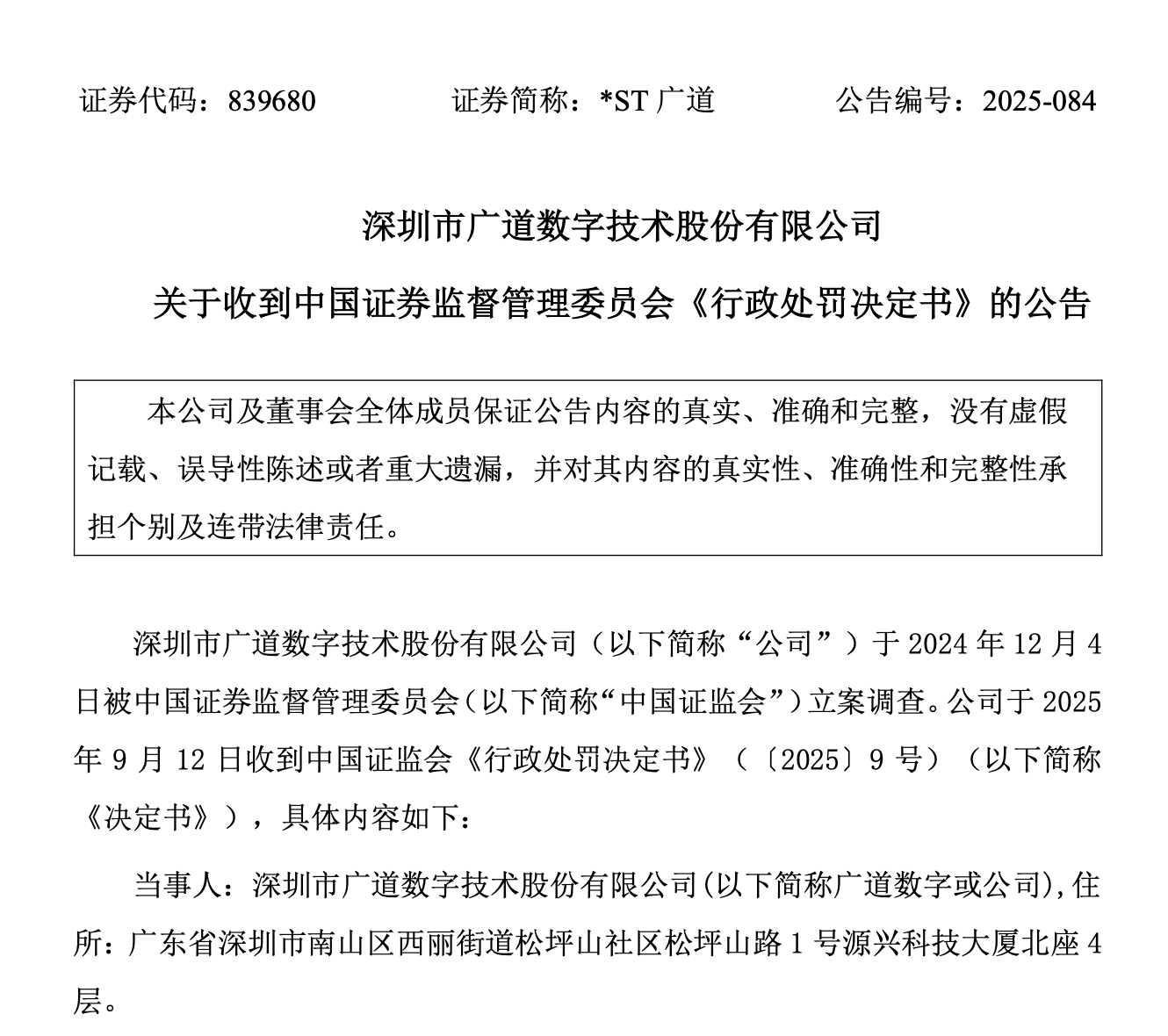 2025年9月12日证监会下达《行政处罚决定书》(〔2025〕9号),公司被“责令改正、警告并罚款1000万元”,多名责任人被罚并对金文明、赵璐实施终身禁入;北交所按重大违法强制退市规则,9月15日起公司停牌进入退市程序。监管结果显示,*ST广道在多个年度几乎“全额造收”,属于系统性、持续性造假,性质恶劣。