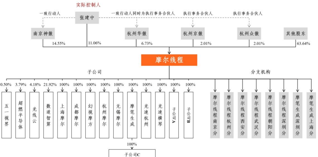 摩尔线程在股权结构上呈现"高度分散与高度集中"的奇特现象。招股书显示,公司无单一持股30%以上的股东,不存在控股股东。