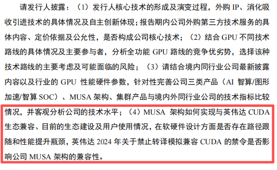 另一方面,公司强调其MUSA架构可高度兼容全球现有GPU应用生态,但英伟达2024年关于禁止转译模拟兼容CUDA的禁令是否会影响摩尔线程的兼容性策略,仍存在不确定性。