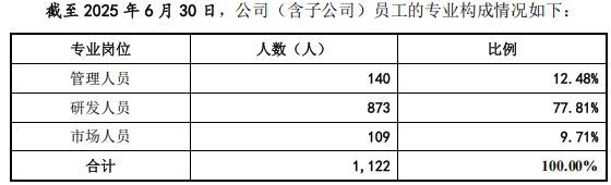 摩尔线程是一家典型的人才密集型企业。2025年公司员工为1122人,其中研发人员为873人,占比高达77.81%。