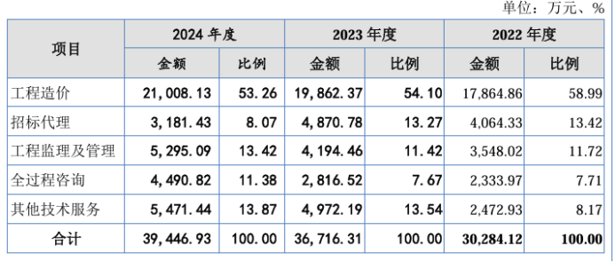 据了解,中诚咨询的营收主要来自主营业务,其中以工程造价在主营收入中的占比为最高,各期分别为58.99%、54.10%、53.26%,其余招标代理、工程监理及管理、全过程咨询、其他技术服务业务各期的主营收入占比平均在10%上下。