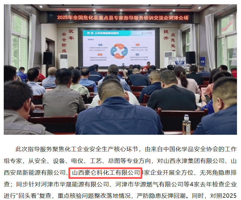据运城市应急管理局消息,8月25日至29日,国家危险化学品重点县检查组深入河津市化工生产企业,开展为期5天的专家指导服务。消息显示,由来自中国化学品安全协会的工作组专家,对包括山西豪仑科化工有限公司在内的3家企业开展全方位、无死角隐患排查。