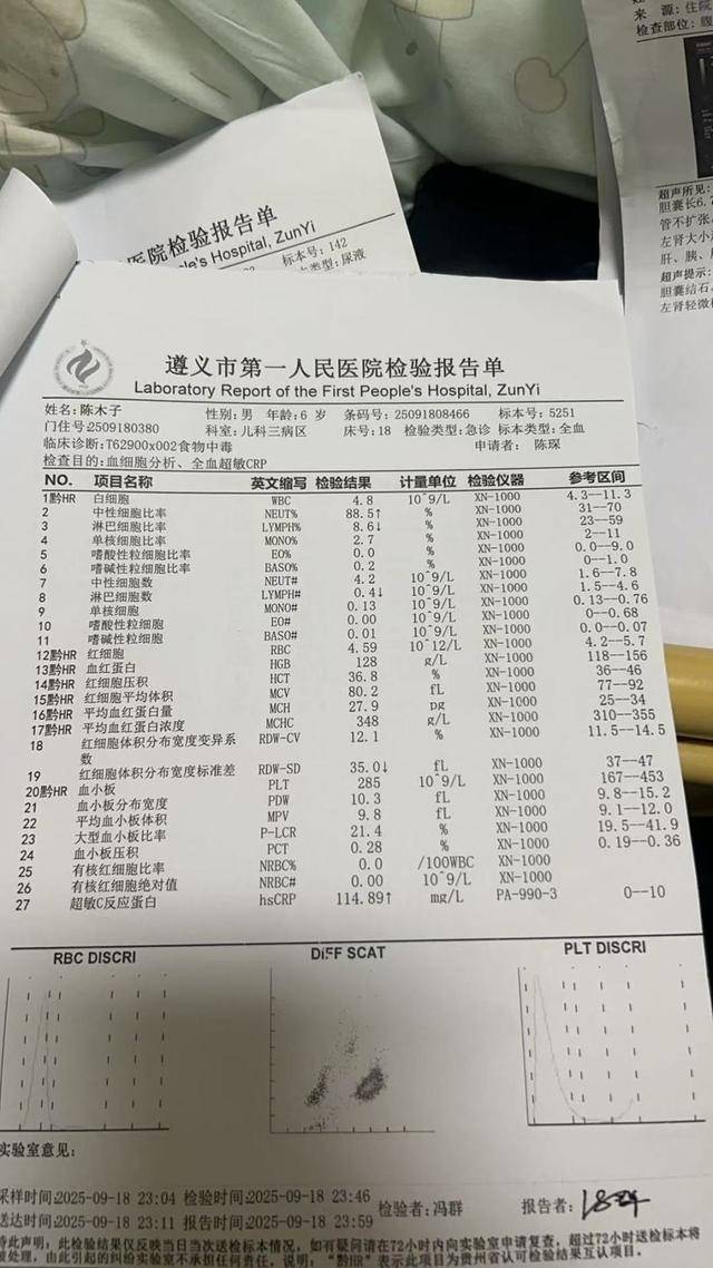 李女士说,孩子们在遵义市第一人民医院的临床诊断结果是食物中毒,而且超敏C反应蛋白超过了110mg/L(参考区间为0-10mg/L)。此外,还有胆囊多发结石和肾积水。