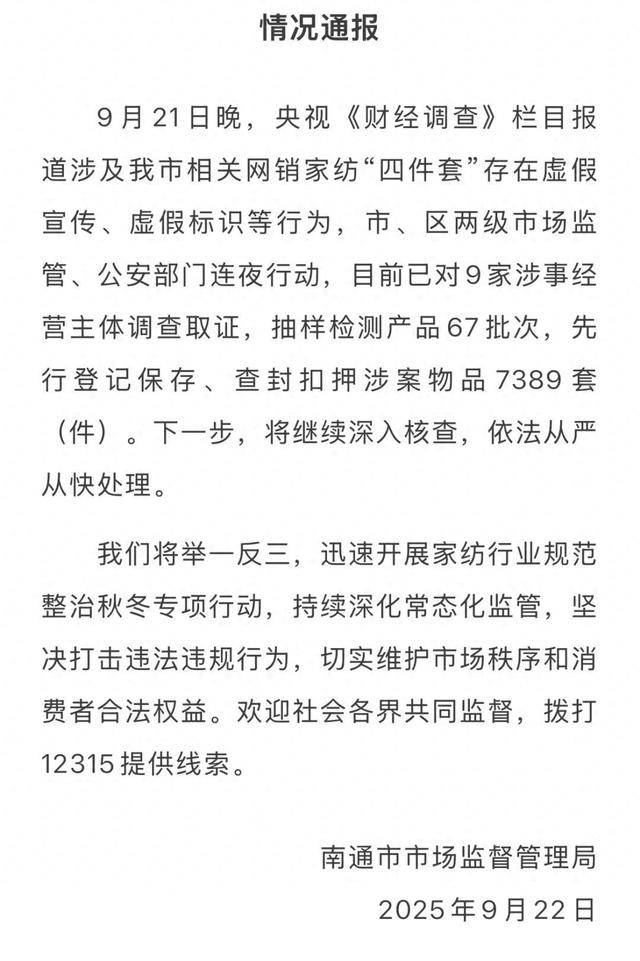 9月21日晚,央视《财经调查》栏目报道涉及我市相关网销家纺“四件套”存在虚假宣传、虚假标识等行为,市、区两级市场监管、公安部门连夜行动,目前已对9家涉事经营主体调查取证,抽样检测产品67批次,先行登记保存、查封扣押涉案物品7389 套(件)。下一步,将继续深入核查,依法从严从快处理。