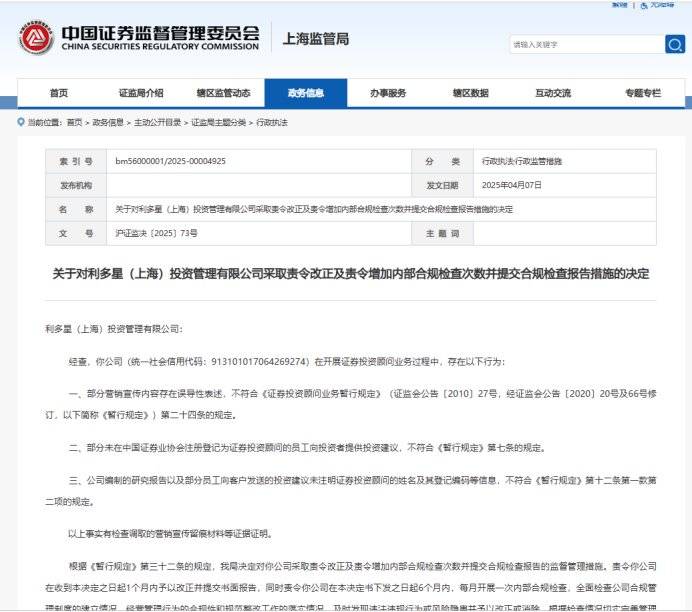 就在今年4月份,证监会上海监管局发布了《关于对利多星(上海)投资管理有限公司采取责令改正及责令增加内部合规检查次数并提交合规检查报告措施的决定》,这一纸行政监管措施,将利多星智投的违规行为公之于众。经调查,利多星在开展证券投资顾问业务时,存在多项严重违规行为。