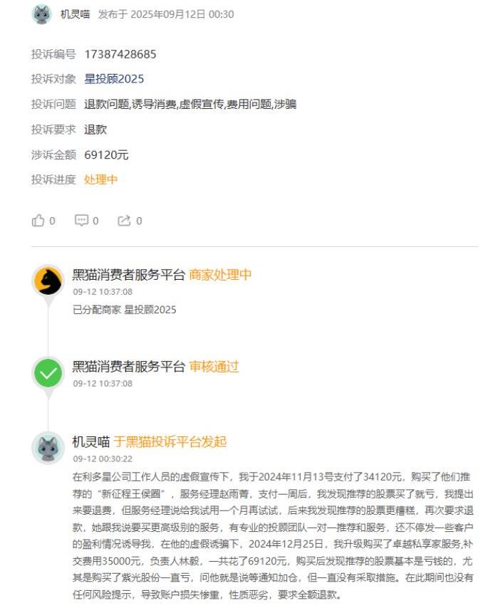 仅今年9月份就有多名消费者在黑猫投诉上面发帖投诉,投诉内容涵盖虚假宣传、服务承诺不兑现、诱导消费升级以及推荐股票亏损却拒绝退款等多个方面。绝大多数投诉的消费者都是购买了利多星智投的产品,但是却没有从资本市场获取相应收益,甚至听从了利多星智投顾问的相关建议,反而造成投资亏损的。