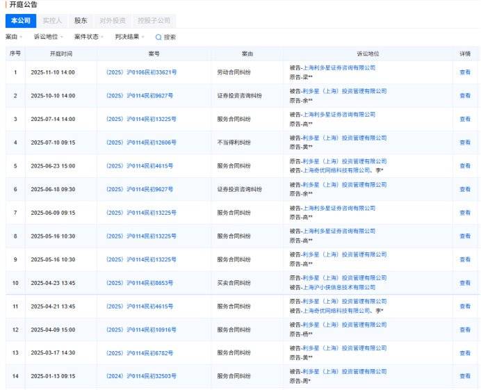 企业预警通信息显示,仅今年以来,利多星就在十多起开庭公告充当被告,其中绝大多数都是服务合同纠纷或者证券投资咨询纠纷。