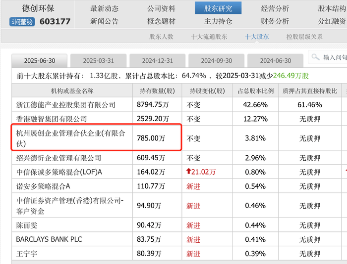 在德创环保的股东名单中,杭州展创赫然在列。截至2025年6月末,杭州展创持有德创环保785万股,占总股本比例为3.81%。