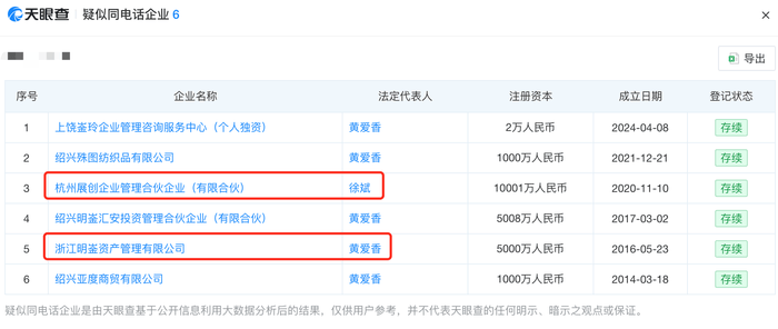 界面新闻在梳理明崟资产的资料时发现,其备注的电话号码,有六家公司共同使用。6家公司中有5家公司的法定代表人均为黄爱香,剩下一家公司:杭州展创企业管理合伙企业(有限公司)(以下简称“杭州展创”),法定代表人为徐斌。进一步看,杭州展创与明崟资产备注的邮箱地址,也是一样的。