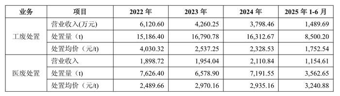 界面新闻从公开信息了解到,受浙江省危废处置行业前几年新批产能陆续建成投产影响,近几年工业危废处置单价大幅下降,处置单价从2022年的4559.9元/吨下降到2025年上半年的1752.54元/吨,而该业务是华鑫环保收入的重要支柱,每年处理量在1.6万吨左右,如今该业务收入大打折扣。尽管医疗废物处理单价有所上升,仍难以抵消整体波动。