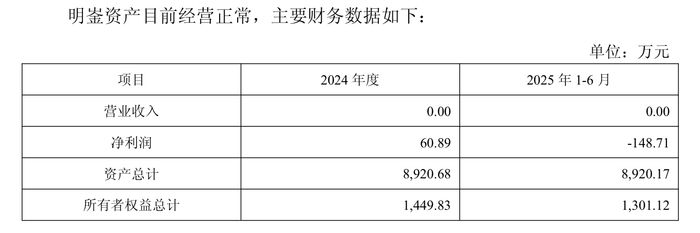 明崟资产的主营业务一栏里显示为“资产管理”,但2024年及2025年上半年营业收入均为0,主要资产是华鑫环保40%股权,其所有者权益2024年为1449.83万元。德创环保对此也明确称,“(明崟资产)近年来无其他重要业务资产”。而截至目前,明崟资产尚欠德能产业控股本金及利息7272万元。