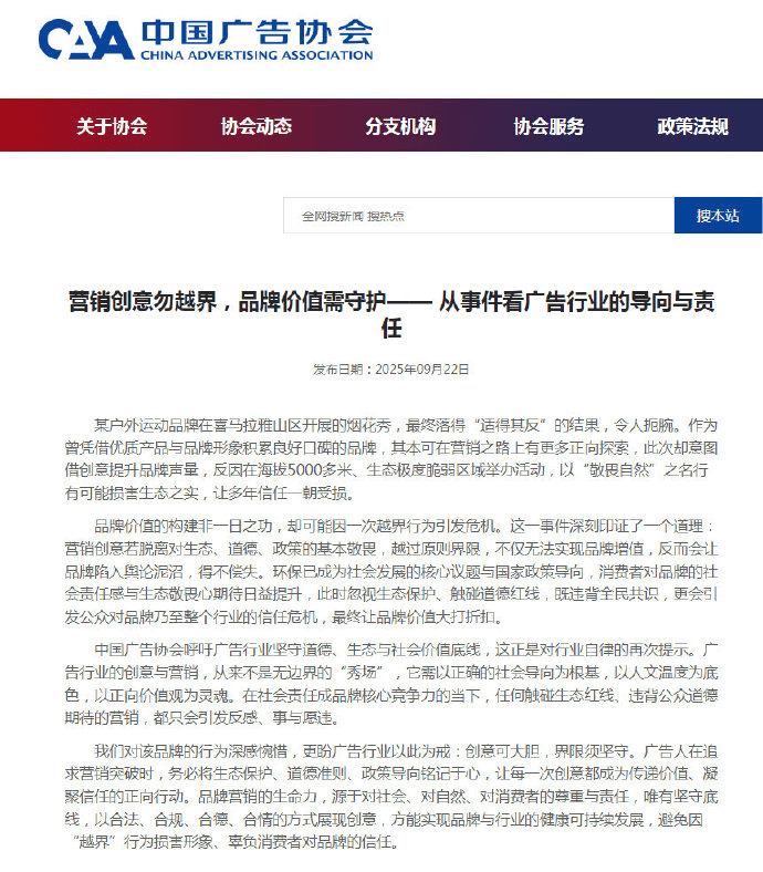 中国广告协会也发文呼吁广告行业坚守道德、生态与社会价值底线,这正是对行业自律的再次提示。广告行业的创意与营销,从来不是无边界的“秀场”,它需以正确的社会导向为根基,以人文温度为底色,以正向价值观为灵魂。在社会责任成品牌核心竞争力的当下,任何触碰生态红线、违背公众道德期待的营销,都只会引发反感、事与愿违。