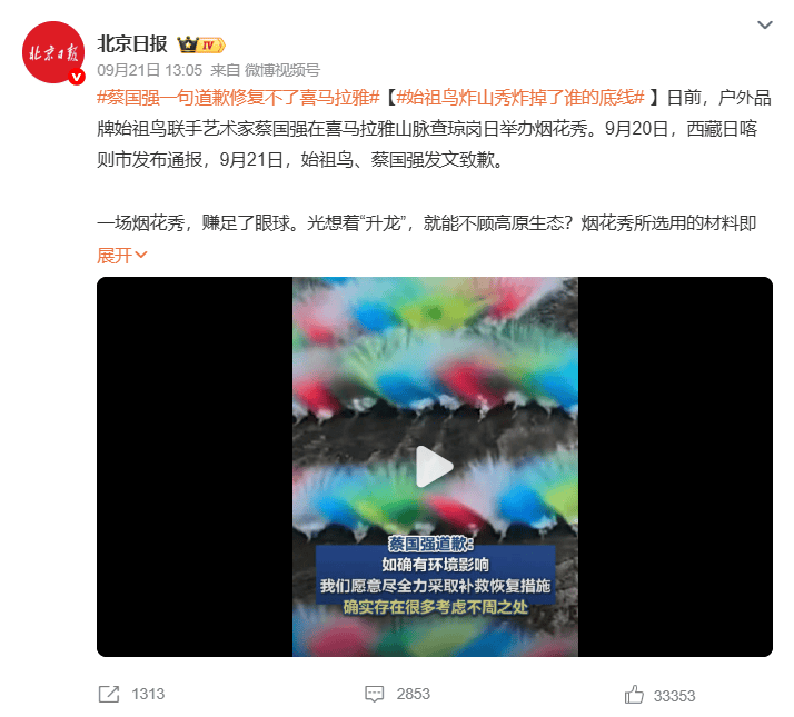 始祖鸟也在国内社媒平台致歉称,对艺术表达边界评估要更专业、对自然要更谦卑,承诺在政府监管下,配合团队复核项目生态影响,邀请第三方评估并依结果补救,同时推进藏地环保计划与文化公益项目。而在其海外社交账号上则称,对青藏高原烟花表演深感遗憾,此行为与品牌环保价值观及期望不符,郑重致歉。同时,还提到“正与相关艺术家和中国团队沟通,调整工作方式避免类似情况”。