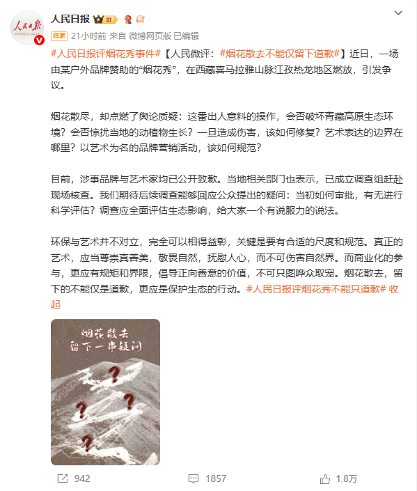 值得关注的是,人民日报就“西藏喜马拉雅山脉高原烟花秀”事件发表了评论,“环保与艺术并不对立,完全可以相得益彰,关键是要有合适的尺度和规范。真正的艺术,应当尊崇真善美,敬畏自然,抚慰人心,而不可伤害自然界。而商业化的参与,更应有规矩和界限,倡导正向善意的价值,不可只图哗众取宠。烟花散去,留下的不能仅是道歉,更应是保护生态的行动。”