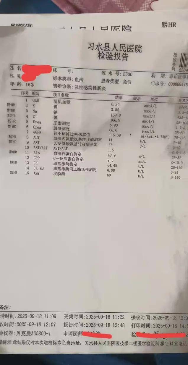 刘刚的女儿今年15岁,就读于习水县一所初中。9月17日,同学帮她买来一份麦可美加乐的三明治,食用后,她很快出现腹痛、腹泻和发热症状。随后,她被送至习水县人民医院,并于18日诊断为急性感染性肠炎,接受输液和灌肠治疗。刘刚告诉《中国新闻周刊》,18日前后,当地有一百多人出现类似症状,她的女儿症状并不算严重,不少重症患者已前往遵义和重庆的医院。