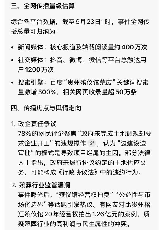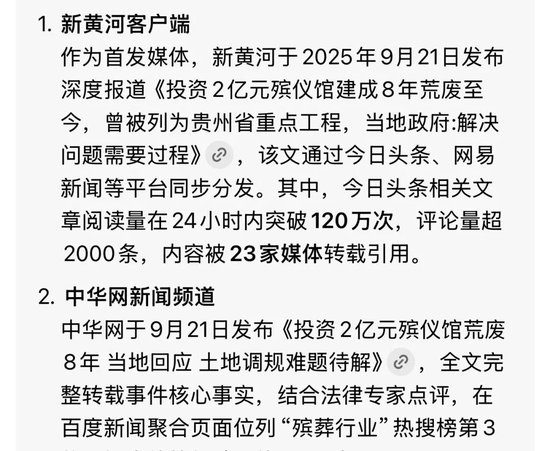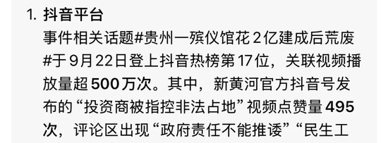 同时,事件相关话题#贵州一殡仪馆花2亿建成后荒废#于9月22日登上抖音热榜第17位,关联视频播放量超500万次。