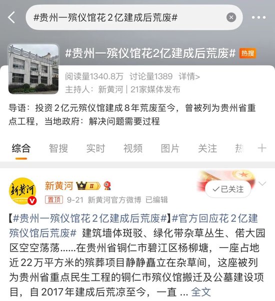 其中仅微博关键词#贵州一殡仪馆花2亿建成后荒废,阅读量就高达1340万。
