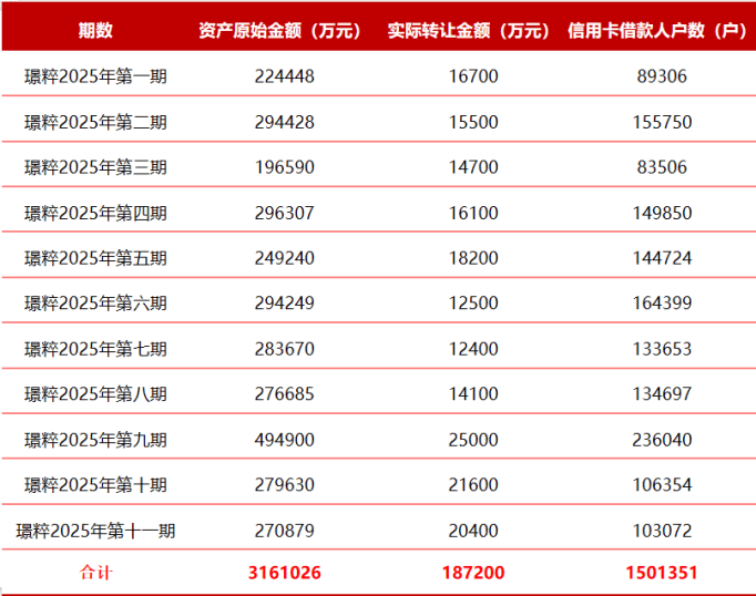 而从2025年至今完成的信用卡不良资产处置情况来看,整体呈现 “甩卖”的态势。根据今年以来广发银行在银登中心发布的不良资产收益权转让公告内容统计,前十一期已成交资产的原始金额为316.10亿元,实际转让金额合计为18.72亿元。据此推算,广发甩卖150万户个人信用卡贷款不良资产的平均折扣率仅有5.92%。