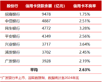 但从同业对比来看,至2024年底,股份行中信用卡贷款余额超 3000 亿元的共 8 家,除光大银行未公布具体信用卡不良率外,其余7家平均不良率为2.63%,较广发银行高出0.44 个百分点,广发信用卡不良率在规模相当的同业中仍处于相对较低水平。
