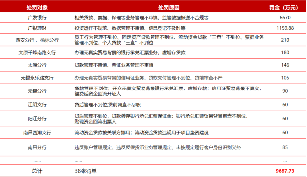 近一年内,广发银行及其分支机构,风险管理及内控问题已经累计收到来自金监局和人民银行等监管部门开出的罚单38张,罚没总金额接近一亿元。