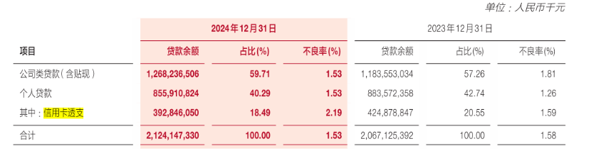 信用卡业务方面,截至2024年末,广发银行累计发行个人信用卡量1.23亿张,信用卡贷款余额为 3928.46 亿元,信用卡透支不良率为 2.19%,较 2023 年上升0.6个百分点,信用卡板块不良压力略有显现。