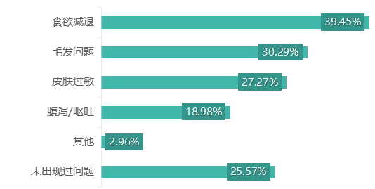 并且质量与安全隐患时有发生。江苏省消保委表示,问卷显示仅有25.57%的宠物食用食品后未出现任何异常,其余反馈中39.45%遇到宠物食欲减退,30.29%发现毛发问题,27.27%反映皮肤过敏等。宠物用品方面,仅23.68%的受访者未遇问题,异常情况中以误食引发健康问题、机械性损伤及行为异常占比最高。此外,根据投诉及舆情,该领域存在宣传与实际不符问题,如宠物粮宣称含鲜肉实则以肉粉为主,用品材质、功能、产地虚构现象普遍。