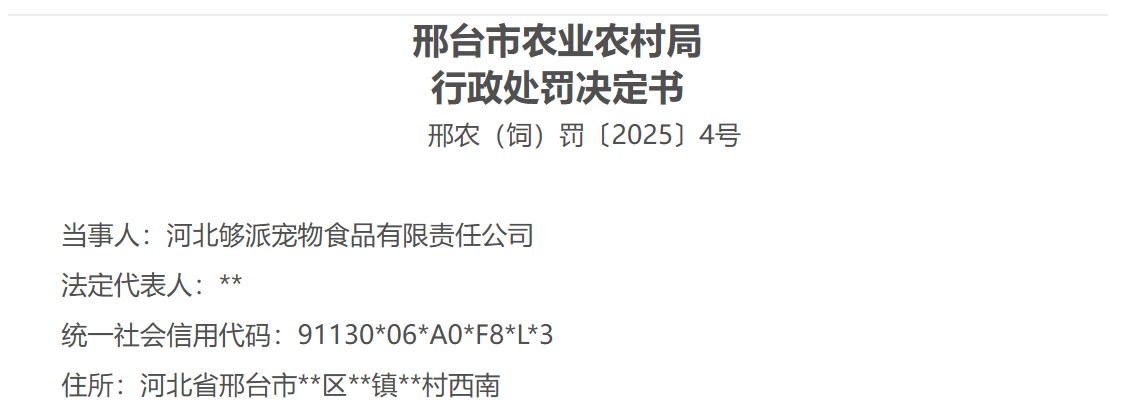 9月18日,因生产的宠物饲料未按规定进行产品质量检验,邢台市农业农村局对河北够派宠物食品有限责任公司处以1.5万元罚款。
