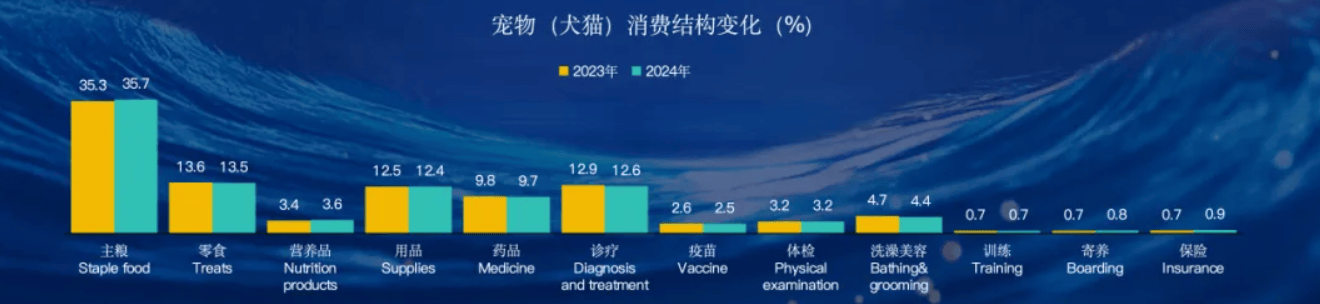 《2025年中国宠物行业白皮书》显示,2024年城镇(犬猫)消费市场规模突破3000亿。从消费结构看,2024年期间,食品市场仍是主要消费市场,市场份额为52.8%。