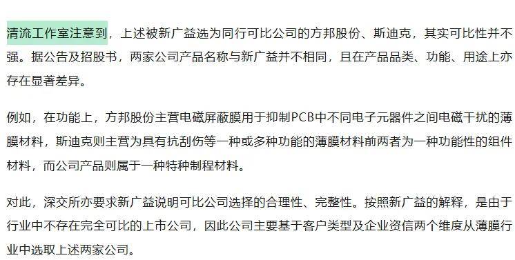 同时,据《网易-清流工作室》的报道:在同行可比公司的选择上,新广益仅选取了方邦股份和斯迪克两家公司,而这两家公司在产品种类、功能及用途上与新广益存在显著差异。相比之下,全球前八强离型膜生产商还包括长阳科技等企业,但新广益并未充分提及这些竞争对手,显示出其市场地位陈述可能被夸大。