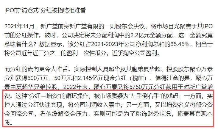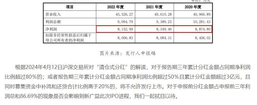 尽管新广益已于9月19日过会,但国家发改委旗下《中宏网》仍发文质疑称:根据2024年4月12日沪深交易所对“清仓式分红”的解读,对于报告期三年累计分红金额占同期净利润比例超过80%的;或者报告期三年累计分红金额占同期净利润比例超过50%且累计分红金额超过3亿元,且同时募集资金中补流和还贷合计比例高于20%的,将不允许发行上市。对于申报前分红金额占申报前三年利润总和86.69%的现象是否会影响到新广益此次IPO进程,需拭目以待。