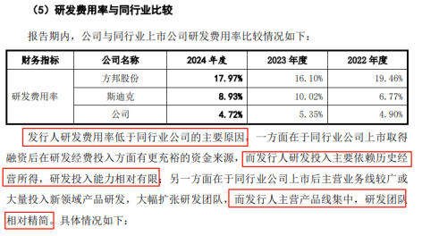 更关键的是,其所谓“技术领先”也缺乏硬核研发支撑:2020-2024年,新广益研发费用分别为2018.82万元、2581.15万元、2232.85万元、2762.37万元、3104.3万元,研发费用率分别为4.93%、5.20%、4.90%、5.35%、4.72%,整体呈波动下降趋势;同期同行企业方邦股份研发费用率维持在14.95%-21.84%,斯迪克维持在5.49%-10.02%,均显著高于新广益。